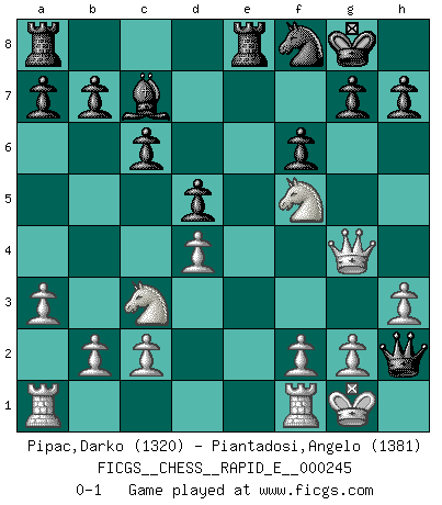 Last move : 0-1 2021 December 11 1:56:2 [Event "FICGS__CHESS__RAPID_E__000245"] [Site "FICGS"] [Date "2021.11.16"] [Round "1"] [White "Pipac,Darko"] [Black "Piantadosi,Angelo"] [Result "0-1"] [WhiteElo "1320"] [BlackElo "1381"] 1.e4 e6 2.d4 d5 3.exd5 exd5 4.a3 Bd6 5.Nc3 c6 6.h3 Ne7 7.Nf3 O-O 8.Bg5 f6 9.Bh4 Re8 10.Be2 Nf5 11.O-O Nxh4 12.Nxh4 Nd7 13.Nf5 Bc7 14.Bg4 Nf8 15.Ne3 Bxg4 16.Qxg4 Qd6 17.Nf5 Qh2+ 0-1 French : Exchange variation Kingside Castling by player Black (move 7) Kingside Castling by player White (move 11) Player Black won this chess game. Follow this game move after move (download)You are for me the Queen on d8 and I am the Pawn on d7 !! (Eduard Gufeld) Es ist besser die Steine des Gegners zu opfern. (Savielly Grigorievitsch Tartakower) No hay precio que sea tan grande por la cabellera del Rey enemigo. (Koblentz) Shah mat. Le roi est mort. Cri de fierté d'un joueur venant de terrasser son adversaire, courtoisement, sans effusion de sang. The Internet is the world's largest library. It's just that all the books are on the floor. (John Allen Paulos)