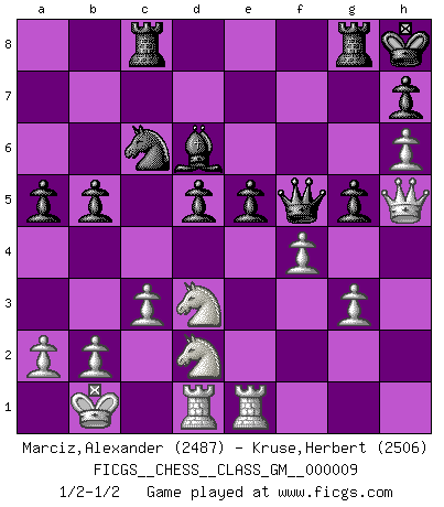 Last move : 1/2-1/2 2022 February 9 14:25:31 [Event "FICGS__CHESS__CLASS_GM__000009"] [Site "FICGS"] [Date "2021.11.21"] [Round "1"] [White "Marciz,Alexander"] [Black "Kruse,Herbert"] [Result "1/2-1/2"] [WhiteElo "2487"] [BlackElo "2506"] 1.d4 Nf6 2.Nf3 e6 3.Bf4 c5 4.e3 d5 5.Nbd2 Nc6 6.c3 cxd4 7.exd4 Nh5 8.Be3 Bd6 9.Ne5 g6 10.Nd3 Ng7 11.g3 b6 12.Nf3 f6 13.h4 Nf5 14.Qd2 O-O 15.O-O-O b5 16.Bh3 Nxe3 17.Qxe3 Re8 18.Kb1 a5 19.Nd2 Kh8 20.Rhe1 e5 21.Bxc8 Rxc8 22.dxe5 fxe5 23.h5 g5 24.h6 Qf6 25.Qf3 Qe6 26.Qh5 Rg8 27.f4 Qf5 1/2-1/2 Queen's pawn game Kingside Castling by player Black (move 14) Queenside Castling by player White (move 15) This chess game ended in a draw. Follow this game move after move (download)Fischer prefers to enter Chess history alone. (Miguel Najdorf) Lisa Lane, amerikanische Schachmeisterin, hatte Fischer einmal als stärksten lebenden Spieler bezeichnet. Antwort: Das ist richtig, aber Lisa Lane ist eigentlich nicht in der Lage, das zu beurteilen. (Robert James Fischer) De todos mis libros Rusos, la defensa contiene y difunde el 'calor' mas grande que pudiese verse extraño al observar lo supremamente abstracto que el Ajedrez supuestamente es. (Vladimir Nabokov) Aidez vos pièces, elles vous aideront. (Paul Morphy) Unless I accept my faults I will most certainly doubt my virtues. (Hugh Prather)