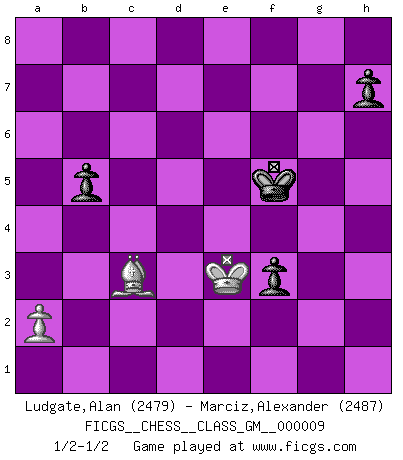 Last move : 1/2-1/2 2022 March 3 7:1:10 [Event "FICGS__CHESS__CLASS_GM__000009"] [Site "FICGS"] [Date "2021.11.21"] [Round "1"] [White "Ludgate,Alan"] [Black "Marciz,Alexander"] [Result "1/2-1/2"] [WhiteElo "2479"] [BlackElo "2487"] 1.d4 d5 2.Bf4 Nf6 3.e3 c5 4.Nf3 Nc6 5.Nbd2 e6 6.c3 Bd6 7.Bg3 O-O 8.Bd3 b6 9.e4 Be7 10.e5 Nh5 11.Ng5 Bxg5 12.Qxh5 g6 13.Qe2 cxd4 14.h4 Bxd2+ 15.Qxd2 dxc3 16.bxc3 d4 17.c4 Qe7 18.Be4 Bb7 19.h5 g5 20.h6 Kh8 21.O-O Rad8 22.f4 d3 23.Rf3 Rd4 24.Re1 Rfd8 25.Bf2 Rxe4 26.Rxe4 Nb4 27.R4e3 Bxf3 28.Rxf3 Nc6 29.Rxd3 gxf4 30.c5 Rxd3 31.Qxd3 Kg8 32.cxb6 axb6 33.Qd6 Qxd6 34.exd6 b5 35.d7 f6 36.Bb6 Kf7 37.d8Q Nxd8 38.Bxd8 Kg6 39.Kf2 Kxh6 40.Bxf6 Kg6 41.Bc3 Kf5 42.Ke2 e5 43.Kd3 e4+ 44.Kd4 f3 45.gxf3 exf3 46.Ke3 1/2-1/2 Queen's pawn, Mason variation Kingside Castling by player Black (move 7) Kingside Castling by player White (move 21) Promotion Queen by player White (move 37) 10 pieces endgame at move 39 : White KBPP , Black KPPPPP WHITE : King + 1 Bishop 2 Pawns BLACK : King + 5 Pawns 9 pieces endgame at move 40 : White KBPP , Black KPPPP WHITE : King + 1 Bishop 2 Pawns BLACK : King + 4 Pawns 8 pieces endgame at move 45 : White KBPP , Black KPPP WHITE : King + 1 Bishop 2 Pawns BLACK : King + 3 Pawns 7 pieces endgame at move 45 : White KBP , Black KPPP WHITE : King + 1 Bishop 1 Pawn BLACK : King + 3 Pawns This chess game ended in a draw. Follow this game move after move (download)Every Pawn is a potential Queen. (James Mason) Schach ist Kampf, hauptsächlich jedoch gegen die eigenen Fehler. (Savielly Grigorievitsch Tartakower) El Ajedrez es parte de la cultura, y si una cultura esta en decadencia, entonces también el Ajedrez declinará. (Mikhail Botvinnik) Un journaliste : 'Vous préférez avoir une dame de plus sur l'échiquier ou au lit ?' Boris Spassky : 'Ca dépend de la position.' God is an atheist. (Unknown)