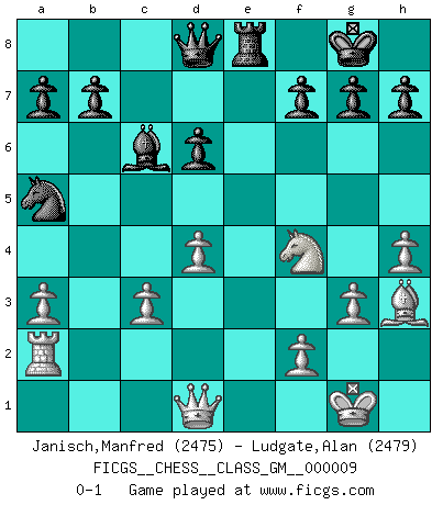Last move : 0-1 2022 March 30 13:58:48 [Event "FICGS__CHESS__CLASS_GM__000009"] [Site "FICGS"] [Date "2021.11.21"] [Round "1"] [White "Janisch,Manfred"] [Black "Ludgate,Alan"] [Result "0-1"] [WhiteElo "2475"] [BlackElo "2479"] 1.e4 e5 2.Nf3 Nf6 3.Nxe5 d6 4.Nf3 Nxe4 5.d4 d5 6.Bd3 Be7 7.O-O Nc6 8.c4 Nb4 9.Be2 O-O 10.Nc3 Bf5 11.a3 Nxc3 12.bxc3 Nc6 13.Re1 Re8 14.Bf4 dxc4 15.Bxc4 Bd6 16.Rxe8+ Qxe8 17.Bxd6 cxd6 18.Ng5 Bg6 19.h4 Qe7 20.g3 Re8 21.Nh3 Qd7 22.Nf4 Na5 23.Bf1 Be4 24.Ra2 Bc6 25.Bh3 Qd8 0-1 Petrov : Classical attack Kingside Castling by player White (move 7) Kingside Castling by player Black (move 9) Player Black won this chess game. Follow this game move after move (download)A chess genius has died; a loss for humanity. (Viktor Kortchnoi, about Bobby Fischer's death) Mein Gehirn das ist mein zweitwichtigstes Organ [Aus dem Film: Der Schläfer]. (Woody Allen) Preferería tener un Peón que un dedo. (Reuben Fine) Les échecs, c'est la lutte contre l'erreur. (Johannes Zukertort) At last I discovered the true beauty of chess. So I proposed to her. (Dinesh De Silva)