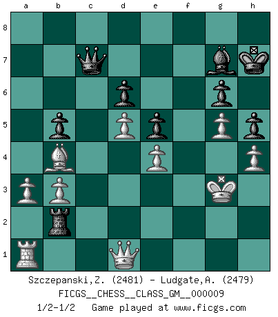 Last move : 1/2-1/2 2022 March 15 6:33:28 [Event "FICGS__CHESS__CLASS_GM__000009"] [Site "FICGS"] [Date "2021.11.21"] [Round "1"] [White "Szczepanski,Zbigniew"] [Black "Ludgate,Alan"] [Result "1/2-1/2"] [WhiteElo "2481"] [BlackElo "2479"] 1.d4 Nf6 2.c4 g6 3.Nc3 Bg7 4.e4 d6 5.h3 O-O 6.Be3 e5 7.d5 Na6 8.g4 Nc5 9.f3 a5 10.h4 h5 11.g5 Nfd7 12.Nh3 c6 13.Qd2 cxd5 14.cxd5 Na6 15.b3 Ndc5 16.Kf2 Bd7 17.Kg2 Qe8 18.Be2 b5 19.Nd1 Qe7 20.Nb2 Rfc8 21.Rhg1 Kh7 22.Nf2 Qd8 23.Rgc1 f5 24.Nbd3 Nxd3 25.Nxd3 Nb4 26.Nxb4 axb4 27.Bd3 Qa5 28.Rxc8 Rxc8 29.Bf2 Rc3 30.Qd1 fxe4 31.Bxe4 Bf5 32.Be1 Bxe4 33.fxe4 Rc5 34.a3 Qc7 35.Bxb4 Rc2+ 36.Kg3 Rb2 37.Rb1 Ra2 38.Ra1 Rb2 1/2-1/2 King's Indian : Makagonov system (5.h3) Kingside Castling by player Black (move 5) This chess game ended in a draw. Follow this game move after move (download)You need not play well - just help your opponent to play badly. (Genrikh Chepukaitis) Ich verachte Kasparow. (Viktor Kortschnoi) Fischer deseaba darle a los Rusos una sopa de su propia medicina. (Larry Evans) Le génie consiste à savoir transgresser les règles au moment opportun. (Teichmann) Waiting for chance ? Play in casinos. (FICGS proverb)