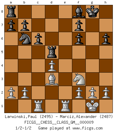 Last move : 1/2-1/2 2022 January 8 7:42:5 [Event "FICGS__CHESS__CLASS_GM__000009"] [Site "FICGS"] [Date "2021.11.21"] [Round "1"] [White "Larwinski,Paul"] [Black "Marciz,Alexander"] [Result "1/2-1/2"] [WhiteElo "2495"] [BlackElo "2487"] 1.d4 d5 2.c4 c6 3.Nf3 Nf6 4.Nc3 e6 5.Bg5 h6 6.Bxf6 Qxf6 7.e3 Nd7 8.Be2 Be7 9.O-O O-O 10.Rc1 Rd8 11.Re1 Bf8 12.cxd5 exd5 13.e4 dxe4 14.Nxe4 Qf4 15.Bd3 Nb6 16.Bb1 Bg4 17.Qc2 Bf5 18.Nf6+ gxf6 19.Qxf5 Qxf5 20.Bxf5 Rd5 21.Bd3 1/2-1/2 QGD Slav : 4.Nc3 Kingside Castling by player White (move 9) Kingside Castling by player Black (move 9) This chess game ended in a draw. Follow this game move after move (download)Tactics flow from a superior position. (Bobby Fischer) Schach ist gnadenlos. Du mußt bereit sein zu töten. (Nigel Short) El Ajedrez es en su esencia, un juego. En su forma, un arte. Y en su ejecución, una ciencia. (Baron Tassilo) Un millionnaire : 'Monsieur Steinitz ! Vous ne participez aux tournois que pour l'argent, alors que moi je n'y viens que pour l'honneur.' Steinitz : 'Chacun joue pour ce qu'il n'a pas'... Sometimes it pays to stay in bed in Monday, rather than spending the rest of the week debugging Monday's code. (Dan Salomon)