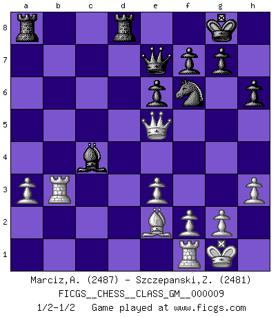 Last move : 1/2-1/2 2022 January 8 13:19:4 [Event "FICGS__CHESS__CLASS_GM__000009"] [Site "FICGS"] [Date "2021.11.21"] [Round "1"] [White "Marciz,Alexander"] [Black "Szczepanski,Zbigniew"] [Result "1/2-1/2"] [WhiteElo "2487"] [BlackElo "2481"] 1.d4 Nf6 2.Nf3 e6 3.Bf4 b6 4.e3 Bb7 5.a3 Be7 6.h3 O-O 7.Nbd2 d5 8.Bd3 c5 9.c3 Bd6 10.Bxd6 Qxd6 11.dxc5 Qxc5 12.Rc1 Nbd7 13.b4 Qe7 14.O-O h6 15.c4 dxc4 16.Nxc4 a5 17.bxa5 bxa5 18.Be2 Bd5 19.Qd4 Rfd8 20.Nfd2 a4 21.Rb1 Nc5 22.Qe5 Nb3 23.Nxb3 axb3 24.Rxb3 Bxc4 1/2-1/2 Queen's pawn game Kingside Castling by player Black (move 6) Kingside Castling by player White (move 14) This chess game ended in a draw. Follow this game move after move (download)When in doubt... play Chess ! (Tevis) Schach wird sich dank seiner hohen kulturellen Tradition immer durchsetzen. In näherer Zukunft womöglich sogar als Gegenreaktion auf die maßlose Reizüberflutung im Freizeit- und Spielbereich. (Garry Kasparov) La caracteristica mas importante en la posición del Ajedrez es la actividad de las piezas. Esto es absolutamente fundamental en todas las fases del juego: Apertura, Juego Medio y especialmente Finales. La limitación primordial en la actividad de una pieza, es la estructuración de los Peones. (Michael Stean) On croit qu'il y a plus de mauvais joueurs que de bons joueurs, c'est faux : Il y a autant de joueurs qui gagnent que de joueurs qui perdent. (Philippe Geluck) O divine art of subtlety and secrecy! Through you we learn to be invisible, through you inaudible and hence we can hold the enemy's fate in our hands. (Sun Tzu)