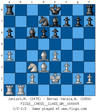 Last move : 1/2-1/2 2021 December 11 4:14:55 [Event "FICGS__CHESS__CLASS_GM__000009"] [Site "FICGS"] [Date "2021.11.21"] [Round "1"] [White "Janisch,Manfred"] [Black "Bernal Varela,Nelson"] [Result "1/2-1/2"] [WhiteElo "2475"] [BlackElo "2454"] 1.e4 c5 2.Nf3 e6 3.d4 cxd4 4.Nxd4 Nc6 5.Nc3 Qc7 6.Be3 a6 7.a3 b5 8.Nxc6 Qxc6 9.Bd3 Bb7 10.Qd2 b4 11.Ne2 bxa3 12.bxa3 Nf6 13.f3 Qc7 14.Qc3 Qxc3+ 15.Nxc3 Bc6 16.Bd4 Be7 17.Ke2 d6 18.Rhb1 Nd7 19.a4 1/2-1/2 Sicilian : Taimanov variation This chess game ended in a draw. Follow this game move after move (download)I have added these principles to the law: get the Knights into action before both Bishops are developed. (Emanuel Lasker) Heutzutage gewinnt im Turnier nicht derjenige Spieler, der weitreichende Pläne entwirft, sondern einfach jener, der Zug um Zug kämpft. (David Bronstein) Ciertamente el estado mental actual de Bobby Fischer es una tragedia. Uno de los mas grandes jugadores de Ajedrez del mundo -el orgullo y pena del Ajedrez Americano. (Frank Brady) Les échecs sont un jeu terrible. Si vous n'avez pas le centre, votre adversaire a une position plus libre. Par contre, si vous avez le centre, alors vous avez vraiment quelque chose pour laquelle vous inquiéter ! (Siegbert Tarrasch) You think that education is too expensive ? Try ignorance. (Derek Bok)