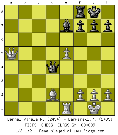 Last move : 1/2-1/2 2022 January 4 1:30:7 [Event "FICGS__CHESS__CLASS_GM__000009"] [Site "FICGS"] [Date "2021.11.21"] [Round "1"] [White "Bernal Varela,Nelson"] [Black "Larwinski,Paul"] [Result "1/2-1/2"] [WhiteElo "2454"] [BlackElo "2495"] 1.e4 e5 2.Nf3 Nc6 3.Bb5 a6 4.Ba4 Nf6 5.O-O Nxe4 6.d4 b5 7.Bb3 d5 8.dxe5 Be6 9.Nbd2 Nc5 10.c3 Be7 11.Bc2 d4 12.Nb3 d3 13.Bb1 Nxb3 14.axb3 Bf5 15.Re1 O-O 16.b4 a5 17.bxa5 Rxa5 18.Rxa5 Nxa5 19.Nd4 Bg6 20.Bxd3 Bxd3 21.Qxd3 c5 22.Qxb5 cxd4 23.Bd2 Qb8 24.Qxa5 Qxb2 25.cxd4 Qxd4 1/2-1/2 Ruy Lopez : Open, 7.Bb3 Kingside Castling by player White (move 5) Kingside Castling by player Black (move 15) This chess game ended in a draw. Follow this game move after move (download)Best by test: 1. e4 (Bobby Fischer) Man gibt nur Pakete auf. (Paul Keres) Aquellos que dicen que entienden al Ajedrez, no entienden nada. (Robert Hubner) Mon pion favori sur ma case favorite ! Bronstein en parlant d'un coup de pion en h5 quand il avait les Noirs. You can think I'm wrong, but that's no reason to quit thinking. (Gregory House, House M.D.)