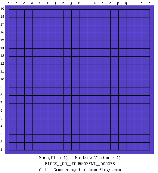 Last move : 0-1 2021 December 21 13:36:39 [Event "FICGS__GO__TOURNAMENT__000095"] [Site "FICGS"] [Date "2021.11.21"] [Round "1"] [Black "Mono,Dima"] [White "Maltsev,Vladimir"] [Result "0-1"] 0-1 This go game has been lost on time (started : 2021.11.21 2:52:8) Here are the names of the openings (joseki) played in the four corners : Player White won this Go (weiqi, baduk) game. Follow this game move after move (download)Learn to play under the stones. (Anonymous) You have to believe in yourself. (Sun Tzu)