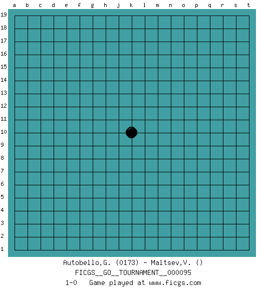 Last move : 1-0 2021 December 21 13:36:39 [Event "FICGS__GO__TOURNAMENT__000095"] [Site "FICGS"] [Date "2021.11.21"] [Round "1"] [Black "Autobello,Giovanni"] [White "Maltsev,Vladimir"] [Result "1-0"] [Rating 1 "0173"] 1.k10 1-0 This go game has been lost on time (started : 2021.11.21 2:52:8) Here are the names of the openings (joseki) played in the four corners : Player Black won this Go (weiqi, baduk) game. Follow this game move after move (download)In an unreasonable situation, an unreasonable move is reasonable. (Tamino) Inventor: A person who makes an ingenious arrangement of wheels, levers and springs, and believes it civilization. (Ambrose Bierce, The Devil's Dictionary)