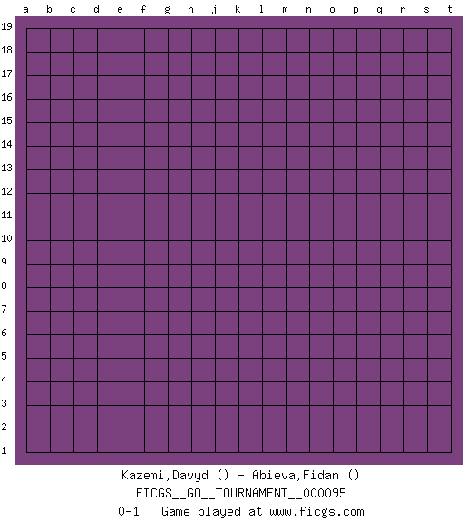 Last move : 0-1 2021 December 21 13:36:39 [Event "FICGS__GO__TOURNAMENT__000095"] [Site "FICGS"] [Date "2021.11.21"] [Round "1"] [Black "Kazemi,Davyd"] [White "Abieva,Fidan"] [Result "0-1"] 0-1 This go game has been lost on time (started : 2021.11.21 2:52:8) Here are the names of the openings (joseki) played in the four corners : Player White won this Go (weiqi, baduk) game. Follow this game move after move (download)Grab the border points between two moyos. (Anonymous) Employ the attack like tactic of defense. (Chinese proverb)