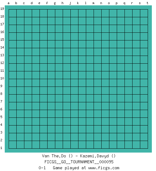 Last move : 0-1 2021 December 21 13:36:39 [Event "FICGS__GO__TOURNAMENT__000095"] [Site "FICGS"] [Date "2021.11.21"] [Round "1"] [Black "Van The,Do"] [White "Kazemi,Davyd"] [Result "0-1"] 0-1 This go game has been lost on time (started : 2021.11.21 2:52:8) Here are the names of the openings (joseki) played in the four corners : Player White won this Go (weiqi, baduk) game. Follow this game move after move (download)Corner, side, centre. (Anonymous) Train yourself to let go of everything you fear to lose. (Master Yoda in Star Wars ep.3)