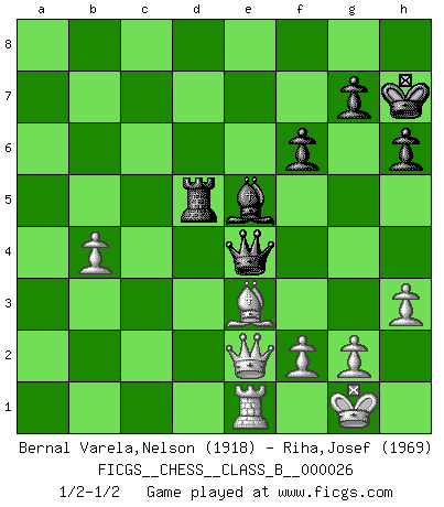 Last move : 1/2-1/2 2007 August 17 22:43:1 [Event "FICGS__CHESS__CLASS_B__000026"] [Site "FICGS"] [Date "2007.07.25"] [Round "1"] [White "Bernal Varela,Nelson"] [Black "Riha,Josef"] [Result "1/2-1/2"] [WhiteElo "1918"] [BlackElo "1969"] 1.e4 c5 2.Nf3 d6 3.d4 Nf6 4.Nc3 cxd4 5.Nxd4 a6 6.Be2 e5 7.Nb3 Be7 8.Qd3 Be6 9.O-O Nc6 10.Nd5 Nxd5 11.exd5 Nb4 12.Qg3 Bf5 13.Bd2 Nxc2 14.Rac1 O-O 15.Bd3 Bxd3 16.Qxd3 Nd4 17.Nxd4 exd4 18.Qxd4 Bf6 19.Qb4 Qd7 20.b3 Rfe8 21.h3 Re2 22.Rcd1 Rae8 23.Rfe1 Qf5 24.Rxe2 Rxe2 25.Be3 h6 26.Qxb7 Bh4 27.Rf1 Rxa2 28.Qb8+ Kh7 29.Qxd6 Ra5 30.Bc5 Bf6 31.b4 Be5 32.Qe7 Ra3 33.Re1 f6 34.Qe6 Qe4 35.Be3 Rd3 36.Qxa6 Rxd5 37.Qe2 1/2-1/2 Sicilian Kingside Castling by player White (move 9) Kingside Castling by player Black (move 14) This chess game ended in a draw. Follow this game move after move (download)In life, as in Chess, one's own Pawns block one's way. A man's very wealth, ease, leisure, children, books, which should help him to win, more often checkmate him. (Charles Buxton) Der Partner hat auch seine Existenzberechtigung. (Savielly Grigorievitsch Tartakower) Las Aperturas te enseñan aperturas. ¡Los Finales te enseñan Ajedrez!. (Stephan Gerzadowicz) Le jeu d'échecs fait naître et fortifie en nous plusieurs qualités précieuses dans le cours de l'existence, telles que la prévoyance, la circonspection, la prudence, et la persévérance. (Benjamin Franklin - 1783, la morale des échecs) Secret operations are essential in war; upon them the army relies to make its every move. (Sun Tzu)