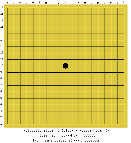 Last move : 1-0 2021 December 21 13:36:39 [Event "FICGS__GO__TOURNAMENT__000095"] [Site "FICGS"] [Date "2021.11.21"] [Round "1"] [Black "Autobello,Giovanni"] [White "Abieva,Fidan"] [Result "1-0"] [Rating 1 "0173"] 1.k10 1-0 This go game has been lost on time (started : 2021.11.21 2:52:8) Here are the names of the openings (joseki) played in the four corners : Player Black won this Go (weiqi, baduk) game. Follow this game move after move (download)When you study joseki, you lose two stones in strength. (Anonymous) Big Chess is a place for big hallucinations. (Thibault de Vassal)