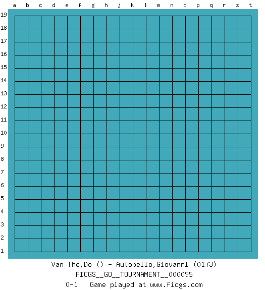 Last move : 0-1 2021 December 21 13:36:39 [Event "FICGS__GO__TOURNAMENT__000095"] [Site "FICGS"] [Date "2021.11.21"] [Round "1"] [Black "Van The,Do"] [White "Autobello,Giovanni"] [Result "0-1"] [Rating 2 "0173"] 0-1 This go game has been lost on time (started : 2021.11.21 2:52:8) Here are the names of the openings (joseki) played in the four corners : Player White won this Go (weiqi, baduk) game. Follow this game move after move (download)The strong player plays straight, the weak diagonally. (Anonymous) Luck is what you have left over after you give 100 percent. (Langston Coleman)