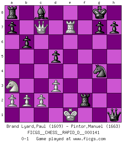 Last move : 0-1 2021 December 4 10:59:39 [Event "FICGS__CHESS__RAPID_D__000141"] [Site "FICGS"] [Date "2021.11.22"] [Round "1"] [White "Brand Lyard,Paul"] [Black "Pintor,Manuel"] [Result "0-1"] [WhiteElo "1609"] [BlackElo "1663"] 1.e4 e5 2.Bc4 Bc5 3.Qh5 Qf6 4.Bxf7+ Qxf7 5.Qxe5+ Be7 6.Qxc7 Nc6 7.Nf3 Qg6 8.O-O Qxe4 9.Na3 Nf6 10.d3 Qg4 11.h3 Qg6 12.Re1 O-O 13.Rxe7 Nxe7 14.Bg5 Ned5 15.Qc4 Kh8 16.Bxf6 Nxf6 17.Ne5 Qh5 18.Re1 d5 19.Qc7 b6 20.g4 Qxh3 21.Nf7+ Kg8 22.Re7 Nxg4 23.Nh6+ Qxh6 24.Kf1 Rxf2+ 25.Ke1 Qh1+ 0-1 Bishop's Opening : Classical variation Kingside Castling by player White (move 8) Kingside Castling by player Black (move 12) Player Black won this chess game. Follow this game move after move (download)There is only one thing Fischer does in Chess without pleasure: to lose ! (Boris Spassky) Zu meiner Zeit war ein 20 jähriger ein junger Spieler, heute ist er ein Veteran. (Garry Kasparov) En partidas rápidas, el Caballo es mas poderoso que el Alfil. (Vlastimil Hort) Votre seul travail dans les ouvertures est d'obtenir un milieu de partie jouable. (Lajos Portish) It's not the will to win, but the will to prepare to win that makes the difference. (Bear Bryant)
