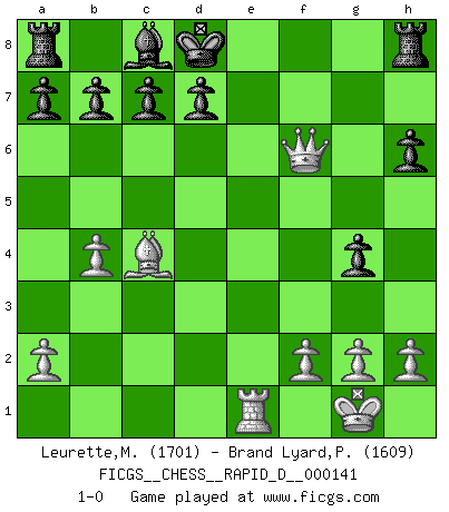 Last move : 1-0 2021 November 27 14:41:36 [Event "FICGS__CHESS__RAPID_D__000141"] [Site "FICGS"] [Date "2021.11.22"] [Round "1"] [White "Leurette,Marc-Antoine"] [Black "Brand Lyard,Paul"] [Result "1-0"] [WhiteElo "1701"] [BlackElo "1609"] 1.e4 e5 2.Nf3 Nc6 3.Bc4 Bc5 4.c3 Qf6 5.d3 h6 6.b4 Bd6 7.Be3 g5 8.d4 exd4 9.cxd4 g4 10.e5 Nxe5 11.dxe5 Bxe5 12.Nxe5 Qxe5 13.O-O Qxa1 14.Bd4 Qxb1 15.Qxb1 f6 16.Qg6+ Kd8 17.Bxf6+ Ne7 18.Bxe7+ Kxe7 19.Re1+ Kd8 20.Qf6+ 1-0 Giuoco Piano Kingside Castling by player White (move 13) Player White won this chess game. Follow this game move after move (download)Half the variations which are calculated in a tournament game turn out to be completely superfluous. Unfortunately, no one knows in advance which half. (Jan Tinman) Der 70jährige Viktor Kortschnoi: Die Rentenanstalt wollte mich zwingen in Rente zu gehen. Meine Frau erhält jetzt eine Pension- und ich zahle weiter in die Rentenkasse ein! (Viktor Kortschnoi) Todo lo que importa ante el tablero de Ajedrez son buenas jugadas. (Bobby Fischer) Pour moi, les échecs ne sont pas un jeu mais un art. (Alexandre Alekhine) Wisdom begins at the end. (Daniel Webster)