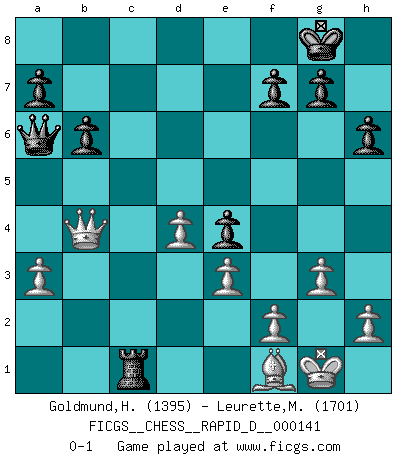 Last move : 0-1 2022 January 3 17:44:14 [Event "FICGS__CHESS__RAPID_D__000141"] [Site "FICGS"] [Date "2021.11.22"] [Round "1"] [White "Goldmund,Heike"] [Black "Leurette,Marc-Antoine"] [Result "0-1"] [WhiteElo "1395"] [BlackElo "1701"] 1.b4 e5 2.Bb2 Bxb4 3.Bxe5 Nf6 4.a3 Be7 5.c4 d6 6.Bb2 b6 7.Nf3 Bb7 8.e3 Nc6 9.Be2 Qd7 10.d3 O-O 11.O-O d5 12.Nbd2 dxc4 13.Nxc4 h6 14.Qb3 Qe6 15.Qc3 Bd6 16.Nxd6 cxd6 17.Rfc1 Rac8 18.Qd2 Ne5 19.Nxe5 dxe5 20.d4 Qd5 21.Bf3 e4 22.Be2 Rxc1+ 23.Rxc1 Qg5 24.Rc7 Rb8 25.Qc3 Nd5 26.Qc4 Qd8 27.Rxb7 Rxb7 28.Qa6 Rc7 29.Qb5 Nc3 30.Bxc3 Rxc3 31.Qb4 Rc1+ 32.Bf1 Qc8 33.g3 Qa6 0-1 Polish (Sokolsky) opening Kingside Castling by player Black (move 10) Kingside Castling by player White (move 11) Player Black won this chess game. Follow this game move after move (download)Chess is above all, a fight ! (Emanuel Lasker) Man gibt nur Pakete auf. (Paul Keres) Una buena ofensiva y una buena defensa, comienzan ambas con un buen desarrollo. (Bruce A. Moon) Le génie consiste à savoir transgresser les règles au moment opportun. (Teichmann) Once you start thinking you have nothing left to learn, you have everything to learn. (Steve Badget)