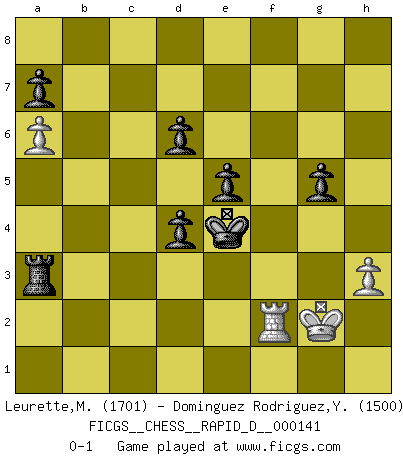 Last move : 0-1 2021 December 16 8:52:6 [Event "FICGS__CHESS__RAPID_D__000141"] [Site "FICGS"] [Date "2021.11.22"] [Round "1"] [White "Leurette,Marc-Antoine"] [Black "Dominguez Rodriguez,Yosvany"] [Result "0-1"] [WhiteElo "1701"] [BlackElo "1500"] 1.e4 c5 2.Nf3 d6 3.Bb5+ Bd7 4.Bxd7+ Qxd7 5.b3 Nf6 6.Bb2 Nxe4 7.d3 Nf6 8.c4 e5 9.Nbd2 Be7 10.O-O O-O 11.Ne4 Nc6 12.Re1 Rab8 13.a3 b5 14.Bc1 Nxe4 15.dxe4 bxc4 16.bxc4 Nd4 17.Nxd4 cxd4 18.Bd2 Rfc8 19.Qc2 Rc5 20.Rec1 h6 21.a4 Rbc8 22.Qa2 Qc6 23.f3 Rxc4 24.Rxc4 Qxc4 25.Qxc4 Rxc4 26.a5 Rc2 27.Bb4 Rb2 28.Ba3 Rb3 29.Bc1 Kf8 30.a6 Ke8 31.h3 Kd7 32.Kf2 Ke6 33.g4 Bg5 34.Bxg5 hxg5 35.Ke2 g6 36.Ra2 f5 37.gxf5+ gxf5 38.exf5+ Kxf5 39.Kf2 Kf4 40.Kg2 Rxf3 41.Rb2 Ra3 42.Rf2+ Ke4 0-1 Sicilian : Canal-Sokolsky attack, 3...Bd7 Kingside Castling by player White (move 10) Kingside Castling by player Black (move 10) Player Black won this chess game. Follow this game move after move (download)You have to have the fighting spirit. You have to force moves and take chances. (Bobby Fischer) Matt entspricht nicht immer den Tatsachen. (Savielly Grigorievitsch Tartakower) Una compensación adecuada por un sacrificio es tener una combinación sólida que conduce a una posición ganadora; una compensación adecuada por una metida de pata es dejar a tu oponente arrebatar una derrota de las fauces de la victoria. (Bruce A. Moon) Même si l'adversaire joue le coup analysé précédemment, recommencez l'analyse en voyant la nouvelle position. Première règle de Blumenfeld We cannot be sure of having something to live for unless we are willing to die for it. (Ernesto Che Guevara)