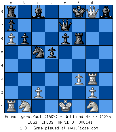 Last move : 1-0 2021 December 30 13:17:11 [Event "FICGS__CHESS__RAPID_D__000141"] [Site "FICGS"] [Date "2021.11.22"] [Round "1"] [White "Brand Lyard,Paul"] [Black "Goldmund,Heike"] [Result "1-0"] [WhiteElo "1609"] [BlackElo "1395"] 1.a4 b6 2.h4 Bb7 3.h5 h6 4.d3 Nf6 5.a5 e6 6.Bf4 d6 7.f3 Be7 8.e4 O-O 9.Bxh6 gxh6 10.b4 Nbd7 11.a6 Bc8 12.d4 Kh7 13.Bd3 c5 14.e5 Kh8 15.Rh3 Nd5 16.bxc5 dxc5 17.Be4 cxd4 18.Bxd5 exd5 19.Qxd4 Nc5 20.e6 Bf6 21.Qf4 fxe6 22.Qxh6+ Kg8 23.Qg6+ Bg7 24.Rg3 Qe7 25.h6 Rf6 26.h7+ Kf8 27.h8Q+ Bxh8 28.Qg8+ 1-0 Comment by player 1 : Paul Brand Lyard : "One frontal Queen-castle for trapped black king; after 24 moves,to one irrémédiable checkmate on 28 moves! & h6... to pressing King on an very very cooked position & h7...h8Q+ ,New Queen2 Sacrifice under bishop forced!! For an stong Assassin Queen1 g6-g8+#!!!!!" A Sandra L. Ware (Meadow Hay) Opening Kingside Castling by player Black (move 8) Promotion Queen by player White (move 27) Player White won this chess game. Follow this game move after move (download)Chess is a more highly symbolic game, but the aggressions are therefore even more frankly represented in the play. It probably began as a war game; that is, the representation of a miniature battle between the forces of two kingdoms. (Karl Meninger) Bis zum Jahr 1971 verlief in meiner Schachkariere alles glatt. Dieses dramatische Match [Fischer-Taimanov 6:0] machte mein Leben zur Hölle. (Mark Taimanov) El jugador blanco perdió porque fallo en recordar la coreccta continuación y tuvo que pensar por sí mismo las movidas. (Siegbert Tarrasch) Je menace de comprendre la position. (Anonyme) The good fighters of old first put themselves beyond the possibility of defeat, and then waited for an opportunity of defeating the enemy. (Sun Tzu)