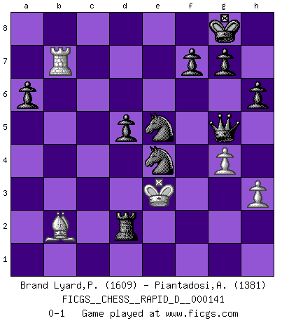 Last move : 0-1 2022 January 6 22:19:22 [Event "FICGS__CHESS__RAPID_D__000141"] [Site "FICGS"] [Date "2021.11.22"] [Round "1"] [White "Brand Lyard,Paul"] [Black "Piantadosi,Angelo"] [Result "0-1"] [WhiteElo "1609"] [BlackElo "1381"] 1.Na3 e5 2.Nb1 d5 3.e3 Nf6 4.Bb5+ Bd7 5.Bxd7+ Nbxd7 6.Nf3 Bd6 7.O-O O-O 8.h3 c5 9.Ng5 h6 10.Nf3 Rc8 11.Re1 Re8 12.d4 cxd4 13.exd4 e4 14.Nfd2 Nb6 15.a4 Nbd7 16.Nc3 Bb4 17.Nb5 a6 18.Na3 Nb6 19.c3 Bd6 20.a5 Nbd7 21.b4 Rxc3 22.g4 Bxb4 23.Nab1 Bxa5 24.Nxc3 Bxc3 25.Rb1 Bxd4 26.Rxb7 e3 27.fxe3 Rxe3 28.Nb3 Rxe1+ 29.Kg2 Rxd1 30.Nxd4 Rxd4 31.Bb2 Rd2+ 32.Kg3 Ne4+ 33.Kf3 Ne5+ 34.Ke3 Qg5+ 0-1 Durkin's attack Kingside Castling by player White (move 7) Kingside Castling by player Black (move 7) Player Black won this chess game. Follow this game move after move (download)What would Chess be without silly mistakes ? (Kurt Richter) Alle offensichtlichen Züge sehen nach dem Spiel in der Analyse verdächtig aus. (Viktor Kortschnoi) Un mal plan es mejor que no tener ningún plan. (Frank Marshall) A ce moment-là, je menaçais de comprendre la position ! (Clément L'Heureux) Be who you are, and say what you feel because those who mind don't matter, and those who matter don't mind. (Dr Seuss)