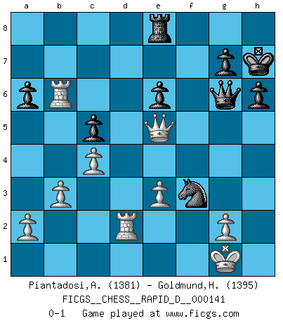 Last move : 0-1 2022 January 31 23:37:30 [Event "FICGS__CHESS__RAPID_D__000141"] [Site "FICGS"] [Date "2021.11.22"] [Round "1"] [White "Piantadosi,Angelo"] [Black "Goldmund,Heike"] [Result "0-1"] [WhiteElo "1381"] [BlackElo "1395"] 1.d4 Nf6 2.c4 e6 3.Nc3 b6 4.Bg5 Bb7 5.e3 Be7 6.Nf3 c5 7.Be2 O-O 8.O-O d6 9.d5 Nbd7 10.b3 a6 11.dxe6 fxe6 12.Rc1 Qc7 13.Nd2 h6 14.Bh4 Qc6 15.Bf3 Qc7 16.Bxb7 Qxb7 17.Bg3 Nh5 18.Nde4 Nxg3 19.hxg3 Rad8 20.Nxd6 Bxd6 21.Qxd6 Rde8 22.Rcd1 Nf6 23.f3 Nh5 24.Ne4 Kh7 25.Qe5 Qf7 26.Nd6 Qg6 27.Nxe8 Rxe8 28.Rd6 Nxg3 29.Rfd1 Nf5 30.Rxb6 Nh4 31.Rd2 Nxf3+ 0-1 Queen's pawn game Kingside Castling by player Black (move 7) Kingside Castling by player White (move 8) Player Black won this chess game. Follow this game move after move (download)Help your pieces so they can help you. (Paul Morphy) Wer nie einen Fehler gemacht hat, hat nie etwas Neues ausprobiert. (Albert Einstein) El Ajedrez es un juego de pelea el cual es puramente intelectual e incluye la suerte. (Richard Reti) Les écrivains ont utilisé les échecs pour analyser les côtés extrêmes de la nature humaine. Dans ce cadre, les échecs offrent un champ d'expérimentation idéal. Mais on pourrait faire la même chose avec la peinture. Et là, en vous référant à Van Gogh, vous ne tirerez pas de conclusion définitive sur les peintres. (Gary Kasparov) Games, world of games... There's always an opponent, and there's always a victim. (Revolver, movie)