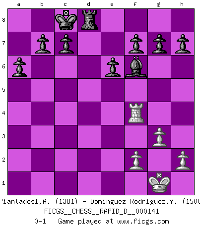 Last move : 0-1 2021 December 25 2:47:41 [Event "FICGS__CHESS__RAPID_D__000141"] [Site "FICGS"] [Date "2021.11.22"] [Round "1"] [White "Piantadosi,Angelo"] [Black "Dominguez Rodriguez,Yosvany"] [Result "0-1"] [WhiteElo "1381"] [BlackElo "1500"] 1.e4 Nf6 2.e5 Nd5 3.d4 d6 4.Nf3 dxe5 5.dxe5 Bg4 6.Be2 Nc6 7.O-O e6 8.c4 Nb6 9.a3 Qxd1 10.Rxd1 Nxe5 11.Nxe5 Bxe2 12.Re1 Bxc4 13.Nxc4 Nxc4 14.Nc3 O-O-O 15.Bf4 Nxb2 16.Re2 Nd3 17.Nb5 Nxf4 18.R2e1 a6 19.Nc3 Bc5 20.Rad1 Bxa3 21.g3 Bb4 22.Re4 Bxc3 23.Rxd8+ Rxd8 24.Rxf4 Bf6 0-1 Alekhine's defense : Modern, Larsen variation Kingside Castling by player White (move 7) Queenside Castling by player Black (move 14) Player Black won this chess game. Follow this game move after move (download)Alekhine is a poet who creates a work of art out of something that would hardly inspire another man to send home a picture post card. (Max Euwe) Auf jeden Fall musst du zuerst Rechtsanwalt werden, damit du deine eigenen Interessen und die deiner Familie vertreten kannst. [Brief an seinen Sohn] (José Raúl Capablanca) El Ajedrez es imaginación. (David Bronstein) Dieu déplace le joueur, et celui-ci la pièce. Quel Dieu derrière Dieu commence donc la trame ? Arturo Perez-Reverte (prix de littérature policière 1993). A bird doesn't sing because it has an answer, it sings because it has a song. (Maya Angelou)