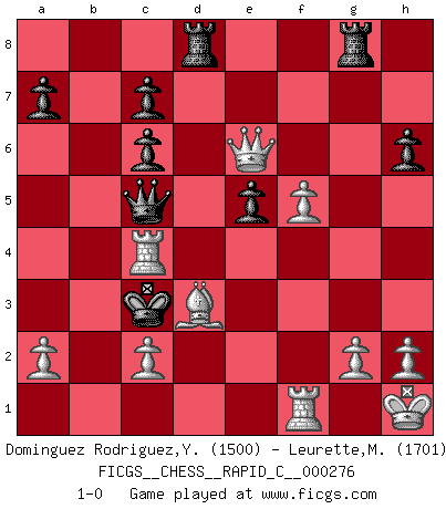 Last move : 1-0 2021 December 10 15:14:10 [Event "FICGS__CHESS__RAPID_C__000276"] [Site "FICGS"] [Date "2021.11.22"] [Round "1"] [White "Dominguez Rodriguez,Yosvany"] [Black "Leurette,Marc-Antoine"] [Result "1-0"] [WhiteElo "1500"] [BlackElo "1701"] 1.e4 e5 2.Nf3 Nc6 3.d4 exd4 4.Nxd4 Nf6 5.Nc3 Bb4 6.Nxc6 bxc6 7.Bd3 Bxc3+ 8.bxc3 d6 9.O-O O-O 10.Bg5 h6 11.Bh4 Be6 12.f4 Bg4 13.Bxf6 Qxf6 14.Qxg4 Qxc3 15.Rad1 Qd4+ 16.Kh1 Qc5 17.Rf3 f6 18.Rh3 Kf7 19.Rf1 Rad8 20.e5 dxe5 21.Qg6+ Ke6 22.Qxg7 Rg8 23.f5+ Kd6 24.Qxf6+ Kd5 25.Qe6+ Kd4 26.Rh4+ Kc3 27.Rc4+ 1-0 Scotch : Schmidt variation Kingside Castling by player White (move 9) Kingside Castling by player Black (move 9) Player White won this chess game. Follow this game move after move (download)By this measure (on the gap between Fischer & his contemporaries), I consider him the greatest world champion. (Garry Kasparov) Das Blackmar-Diemer-Gambit verändert den ganzen Menschen! (Emil Joseph Diemer) Evita las multitudes. Haz independientemente tu propio razonamiento. Trata de ser el jugador de Ajedrez, no la pieza de Ajedrez. (Ralph Charell) Toute estimation doit être constamment réévaluée. (Jacob Estrin) Wikichess, chess moves explained by 'experimented' players. (Thibault de Vassal)