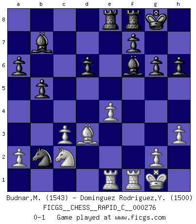 Last move : 0-1 2021 December 11 6:56:33 [Event "FICGS__CHESS__RAPID_C__000276"] [Site "FICGS"] [Date "2021.11.22"] [Round "1"] [White "Budnar,Milos"] [Black "Dominguez Rodriguez,Yosvany"] [Result "0-1"] [WhiteElo "1543"] [BlackElo "1500"] 1.e4 c5 2.Nf3 d6 3.d4 cxd4 4.Nxd4 Nf6 5.Nc3 a6 6.Bd3 g6 7.O-O Bg7 8.Bg5 h6 9.Bh4 O-O 10.h3 b5 11.Qf3 Bb7 12.Bxf6 Bxf6 13.Qe3 Qb6 14.Nce2 Nd7 15.c3 e5 16.Nc2 Bg5 17.Qxb6 Nxb6 18.f4 exf4 19.Nxf4 Rae8 20.Rae1 Na4 21.Nd5 Nxb2 22.Nf6+ Bxf6 0-1 Sicilian : Najdorf Kingside Castling by player White (move 7) Kingside Castling by player Black (move 9) Player Black won this chess game. Follow this game move after move (download)No price is too great for the scalp of the enemy King. (Koblentz) Zum Sieg gelangt man nicht, wenn man gut, sondern nur wenn man besser spielt (Savielly Grigorievitsch Tartakower) El Ajedrez es un mar en el cual un mosquito puede beber y un elefante puede bañarse. (Refrán Hindú) Je menace de comprendre la position. (Anonyme) Thus, what is of supreme importance in war is to attack the enemy's strategy. (Sun Tzu)