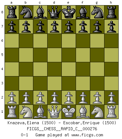 Last move : 0-1 2021 December 22 3:33:33 [Event "FICGS__CHESS__RAPID_C__000276"] [Site "FICGS"] [Date "2021.11.22"] [Round "1"] [White "Knazeva,Elena"] [Black "Escobar,Enrique"] [Result "0-1"] [WhiteElo "1500"] [BlackElo "1500"] 0-1 This chess game has been lost on time (started : 2021.11.22 1:5:39) Player Black won this chess game. Follow this game move after move (download)Some sacrifices are sound; the rest are mine. (Mikhail Tal) Je älter ich werde, um so mehr schätze ich die Bauern. (Paul Keres) Un buen jugador siempre tiene buena suerte. (José Raúl Capablanca) Les ravages du H expliquent la différence de niveau entre Tal et Thal [Abergel]. All art requires courage. (Anne Tucker)