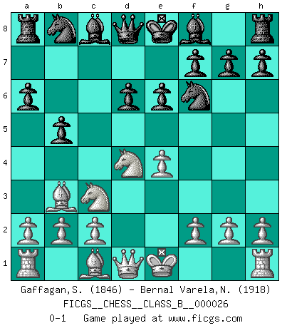 Last move : 0-1 2007 September 8 7:30:34 [Event "FICGS__CHESS__CLASS_B__000026"] [Site "FICGS"] [Date "2007.07.25"] [Round "1"] [White "Gaffagan,Steven"] [Black "Bernal Varela,Nelson"] [Result "0-1"] [WhiteElo "1846"] [BlackElo "1918"] 1.e4 c5 2.Nf3 d6 3.d4 cxd4 4.Nxd4 Nf6 5.Nc3 a6 6.Bc4 e6 7.Bb3 b5 0-1 This chess game has been lost on time (started : 2007.07.25 0:43:9) Sicilian : Najdorf, Lipnitzky attack Player Black won this chess game. Follow this game move after move (download)I had a toothache during the first game. In the second game I had a headache. In the third game it was an attack of rheumatism. In the fourth game, I wasn't feeling well. And in the fifth game? Well, must one have to win every game ? (Siegbert Tarrasch) Ein Schachgenie ist jemand der verdammt gut Schach spielt. (Jonathan Levitt) Ayuda a tus piezas para que ellas te puedan ayudar. (Paul Morphy) Le plus grand jeu de l'esprit jamais inventé, plus vous l'apprenez, plus vous y prenez du plaisir. (Garry Kasparov) Bobby never cared about money, though. His only desire was to prove that his choices were correct: He wanted chess to be important because he was a chess player, and he wanted to be important. Bobby knew money was important, but he didn't have a clue why, outside of clothes and status. The only way he could accomplish what he wanted was to fight for a lot of money. Once he got it, he gave it away. He did not know how to spend it. And once he'd become champion, after, essentially, sacrificing his life for it, he didn't know how to spend his time. (Bob Wade)