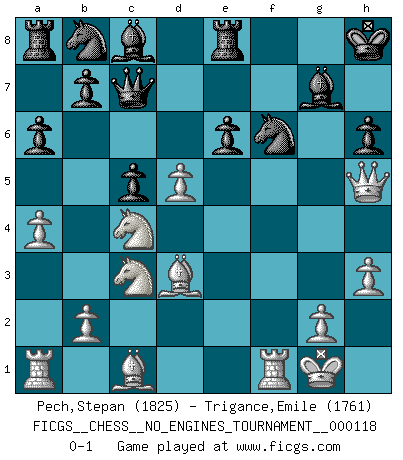 Last move : 0-1 2022 April 23 9:21:42 [Event "FICGS__CHESS__NO_ENGINES_TOURNAMENT__000118"] [Site "FICGS"] [Date "2021.11.23"] [Round "1"] [White "Pech,Stepan"] [Black "Trigance,Emile"] [Result "0-1"] [WhiteElo "1825"] [BlackElo "1761"] 1.d4 Nf6 2.c4 c5 3.d5 e6 4.Nc3 exd5 5.cxd5 d6 6.e4 g6 7.Nf3 Bg7 8.h3 O-O 9.Bd3 h6 10.O-O g5 11.Nd2 a6 12.a4 Re8 13.Nc4 Qc7 14.f4 g4 15.e5 dxe5 16.fxe5 Nh7 17.e6 fxe6 18.Qxg4 Kh8 19.Qh5 Nf6 0-1 This chess game has been lost on time (started : 2021.11.23 1:27:1) Benoni : Classical with e4 and Nf3 Kingside Castling by player Black (move 8) Kingside Castling by player White (move 10) Player Black won this chess game. Follow this game move after move (download)It is no time to be playing Chess when the house is on fire. (Italian Proverb) Moralische Siege zählen nicht. (Savielly Grigorievitsch Tartakower) Desconfianza es la característica mas necesaria de un jugador de Ajedrez. (Siegbert Tarrasch) Les Echecs, c'est l'art de la guerre sans les charniers, c'est la résurrection des morts tombés au champ d'honneur, l'espoir perpétuel, la suprématie de l'intelligence sur la force, la culture de l'esprit. (F. Szpiner) When the going gets tactical, the computers get going. (Hyatt)