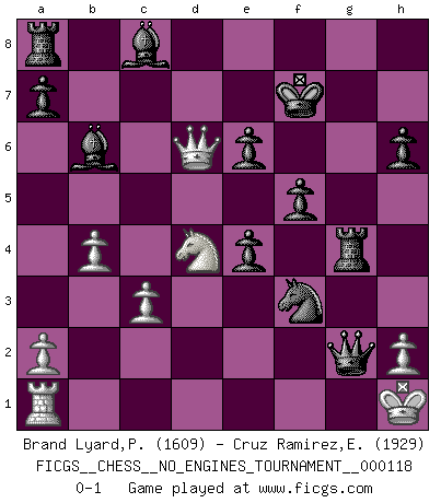 Last move : 0-1 2021 December 16 23:39:32 [Event "FICGS__CHESS__NO_ENGINES_TOURNAMENT__000118"] [Site "FICGS"] [Date "2021.11.23"] [Round "1"] [White "Brand Lyard,Paul"] [Black "Cruz Ramirez,Eliecer"] [Result "0-1"] [WhiteElo "1609"] [BlackElo "1929"] 1.e4 e6 2.d4 d5 3.Bb5+ c6 4.Bd3 dxe4 5.Bc4 Nf6 6.Bg5 h6 7.Bxf6 gxf6 8.Nh3 b5 9.Bb3 c5 10.c3 f5 11.dxc5 Bxc5 12.O-O Nd7 13.Bxe6 fxe6 14.b4 Bb6 15.Qh5+ Kf8 16.Rd1 Qc7 17.Ng5 Ne5 18.Rd8+ Qxd8 19.Na3 Qxg5 20.Qd1 Rg8 21.g3 Qf4 22.Nxb5 Qxf2+ 23.Kh1 Nf3 24.Qd6+ Kf7 25.g4 Rxg4 26.Nd4 Qg2+ 0-1 French defense Kingside Castling by player White (move 12) Player Black won this chess game. Follow this game move after move (download)It is always better to sacrifice your opponent's men. (Savielly Tartakower) Meine Liebe ist Schach, Schach, Schach. Ich muss jeden Tag Schach spielen, deshalb fühle ich mich so stark. (Miguel Najdorf) No soy una persona materialista y por eso, no resiento la falta o pérdida del dinero. La ausencia de cosas mundanas carece de importancia. Ya que el Ajedrez es una forma en la que puedo ser tan materialista como yo desee sin tener la necesidad de vender mi alma. (Jamie Walter Adams) Vous savez, camarade Pachman, je n'éprouve pas de plaisir à être ministre, je jouerais plutôt aux échecs comme vous, ou alors ferais une révolution au Venezuela. (Che Guevara à Ludek Pachman, 'Checkmate in Prague', 1975) The message for business people contemplating their place in the cyberspace is simple and direct: get linked or get lost. (Vic Sussman and Kenan Pollack)