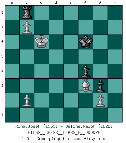 Last move : 1-0 2007 September 5 18:32:12 [Event "FICGS__CHESS__CLASS_B__000026"] [Site "FICGS"] [Date "2007.07.25"] [Round "1"] [White "Riha,Josef"] [Black "Deline,Ralph"] [Result "1-0"] [WhiteElo "1969"] [BlackElo "1822"] 1.e4 e5 2.Nf3 Nc6 3.Bc4 Bc5 4.c3 Nf6 5.d3 a6 6.O-O Ba7 7.Bb3 d6 8.Be3 Bxe3 9.fxe3 O-O 10.a3 d5 11.exd5 Nxd5 12.Qe1 Nf6 13.d4 exd4 14.cxd4 Qe7 15.Nc3 Bg4 16.h3 Bh5 17.Nh4 Rae8 18.Nf5 Qd8 19.Rf4 Bg6 20.Qf2 Bxf5 21.Rxf5 Qe7 22.e4 Qd7 23.Rd1 Nxe4 24.Nxe4 Rxe4 25.Rf1 Nd8 26.Bd5 Re7 27.Ba2 Rfe8 28.Kh1 c6 29.Kg1 Qc7 30.Bc4 b5 31.Ba2 a5 32.Rf4 a4 33.Qh4 Qd7 34.Qh5 Ne6 35.Rg4 Qa7 36.Kh1 Qb7 37.d5 cxd5 38.Bxd5 Qd7 39.Ba2 Rc8 40.Bb1 g6 41.Qh6 Rc5 42.Rh4 f5 43.Ba2 Re5 44.Rb4 Re2 45.Qc1 Qb7 46.Rf3 Kh8 47.Qc3+ Ng7 48.Bc4 Re1+ 49.Rf1 R1e5 50.Qd3 Re3 51.Qd5 Qxd5 52.Bxd5 Ne6 53.Rxb5 Kg7 54.Bc4 Re4 55.Rb4 Nc5 56.Rc1 Ra7 57.Kg1 Kf6 58.Rb6+ Kg5 59.Bd5 Nd7 60.Rb5 Rd4 61.Bf3 Nf6 62.Bc6 h5 63.Rb4 Rxb4 64.axb4 Nd7 65.b5 Nb8 66.Kf2 Kf6 67.Ke3 Re7+ 68.Kd3 Re6 69.Rc4 g5 70.Kc3 Ke7 71.Rc5 g4 72.hxg4 hxg4 73.Bb7 f4 74.Rg5 g3 75.Bf3 Nd7 76.Kb4 Kf6 77.Rg4 Kf5 78.Rg8 Ne5 79.Rf8+ Kg5 80.Be4 Nd7 81.Rg8+ Kf6 82.Bc6 Ne5 83.Bd5 Rb6 84.Rf8+ Kg5 85.Kxa4 Rd6 86.Ba8 Nd7 87.Rg8+ Kf6 88.Kb3 Ke6 89.Rh8 Ne5 90.Re8+ Kf6 91.Be4 Nd7 92.Kc3 Kf7 93.Rh8 Ke6 94.Rh1 Nf6 95.Bf3 Kf5 96.Rd1 Rb6 97.Kb4 Rb8 98.Kc5 Ne4+ 99.Kc6 Ng5 100.Rd5+ Kf6 101.Rxg5 Kxg5 102.b6 Kf6 103.b7 1-0 Giuoco Piano Kingside Castling by player White (move 6) Kingside Castling by player Black (move 9) 10 pieces endgame at move 101 : White KRBPPP , Black KRPP WHITE : King + 1 Rook 1 Bishop 3 Pawns BLACK : King + 1 Rook 2 Pawns 9 pieces endgame at move 101 : White KBPPP , Black KRPP WHITE : King + 1 Bishop 3 Pawns BLACK : King + 1 Rook 2 Pawns Player White won this chess game. Follow this game move after move (download)Bobby Fischer's current state of mind is indeed a tragedy. One of the world's greatest Chess players - the pride and sorrow of American Chess. (Frank Brady) Je älter ich werde, um so mehr schätze ich die Bauern. (Paul Keres) Nunca nadie ha ganado una partida de Ajedrez rindiendose. (Unknown) Si je n'étais pas joueur d'échecs, je serais le meilleur dans quelque chose d'autre. (Anatoli Karpov) That's absurd. I love it. (Gregory House, House M.D.)