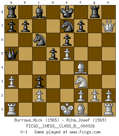 Last move : 0-1 2007 September 27 4:7:28 [Event "FICGS__CHESS__CLASS_B__000026"] [Site "FICGS"] [Date "2007.07.25"] [Round "1"] [White "Burrows,Nick"] [Black "Riha,Josef"] [Result "0-1"] [WhiteElo "1965"] [BlackElo "1969"] 1.e4 e6 2.d4 d5 3.Nc3 Bb4 4.e5 c5 5.a3 Ba5 6.b4 cxd4 7.Qg4 Ne7 8.bxa5 dxc3 9.Qxg7 Rg8 10.Qxh7 Nbc6 11.Nf3 Qc7 12.Bf4 Qxa5 0-1 French : Winawer, Advance, 5.a3 Player Black won this chess game. Follow this game move after move (download)Chess is a part of culture and if a culture is declining then Chess too will decline. (Mikhail Botvinnik) Ich würde mich als ganz normalen Jungen bezeichnen [Im Alter von 12]. (Sergej Karjakin) Coloca el contenido del tablero de Ajedrez en un sombrero, agita las piezas vigorosamente, derrámalas en el tablero desde una altura de medio metro y así obtienes el estilo de Wilhelm Steinitz. (H. E. Bird) L'attaque fait le spectacle, la défense gagne les matchs. (Dicton footballistique) Big Chess is a place for big hallucinations. (Thibault de Vassal)