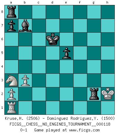 Last move : 0-1 2021 December 11 5:28:26 [Event "FICGS__CHESS__NO_ENGINES_TOURNAMENT__000118"] [Site "FICGS"] [Date "2021.11.23"] [Round "1"] [White "Kruse,Herbert"] [Black "Dominguez Rodriguez,Yosvany"] [Result "0-1"] [WhiteElo "2506"] [BlackElo "1500"] 1.e4 c5 2.Nf3 Nc6 3.Bb5 e6 4.Bxc6 bxc6 5.b3 f6 6.O-O Ne7 7.Nh4 g6 8.Ba3 d6 9.d4 cxd4 10.Qxd4 g5 11.Qxf6 Rg8 12.e5 gxh4 13.Qxh4 Ng6 14.Qxh7 Rg7 15.Qh5 Qh4 16.Qxh4 Nxh4 17.exd6 Rxg2+ 18.Kh1 c5 19.Bxc5 Bb7 20.f3 Rxc2 21.Bf2 Nxf3 22.d7+ Kxd7 23.Rd1+ Bd6 24.Rxd6+ Kxd6 25.Bg3+ e5 26.Na3 Nxh2 27.Kg1 Rg2+ 28.Kh1 Rxg3 29.Kxh2 Rg2+ 0-1 Sicilian : Nimzovich-Rossolimo attack (without ...d6) Kingside Castling by player White (move 6) Player Black won this chess game. Follow this game move after move (download)Pawns: they are the soul of this game, they alone form the attack and defense. (Philidor) Ich suche im Schach immer etwas Eigenes. Riskantes Spiel im Stile schachlicher Musketiere ist nicht meine Sache, auch wenn es vielen Freunden scharfer Wendungen gefällt. (Anatoly Karpov) Si yo gano un torneo, yo lo gano por mí mismo. Yo hago las jugadas. Nadie me ayuda. (Bobby Fischer) Dieu déplace le joueur, et celui-ci la pièce. Quel Dieu derrière Dieu commence donc la trame ? Arturo Perez-Reverte (prix de littérature policière 1993). Man is reluctant to give credit for intelligence to anyone, except his enemies. (Albert Einstein)