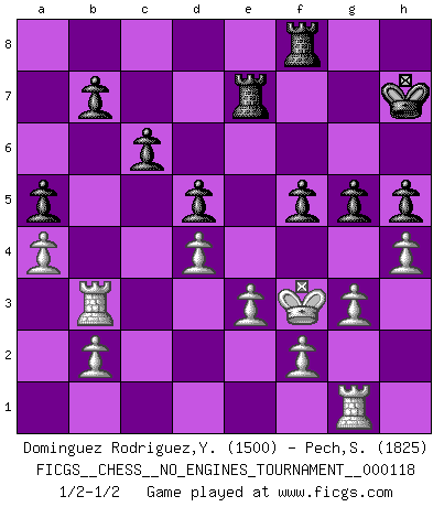 Last move : 1/2-1/2 2022 May 25 16:2:52 [Event "FICGS__CHESS__NO_ENGINES_TOURNAMENT__000118"] [Site "FICGS"] [Date "2021.11.23"] [Round "1"] [White "Dominguez Rodriguez,Yosvany"] [Black "Pech,Stepan"] [Result "1/2-1/2"] [WhiteElo "1500"] [BlackElo "1825"] 1.Nf3 d5 2.d4 Nf6 3.c4 c6 4.Nc3 e6 5.Bg5 h6 6.Bh4 Nbd7 7.e3 Be7 8.cxd5 exd5 9.Bd3 O-O 10.O-O Re8 11.Qc2 Ne4 12.Bxe7 Qxe7 13.Nd2 Ndf6 14.Rac1 Bf5 15.Ncxe4 Nxe4 16.Bxe4 Bxe4 17.Nxe4 Qxe4 18.Qxe4 Rxe4 19.a4 a5 20.Rc3 f5 21.Rb3 Re7 22.g3 g5 23.Kg2 h5 24.Kf3 Kh7 25.Rg1 Rf8 26.h4 1/2-1/2 Reti Opening Kingside Castling by player Black (move 9) Kingside Castling by player White (move 10) This chess game ended in a draw. Follow this game move after move (download)Different people feel differently about resigning. (Bobby Fischer) Ohne ihre Erfolge schmälern zu wollen würde ich sagen Petrosian, Spassky und Karpov verdanken ihre Siege ihren Trainern - Boleslavsky, Bondarevsky und Furman. (Mikhail Moiseyevich Botvinik) El Ajedrez no es una pizca de inferior al violín, y tenemos un gran número de violinistas profesionales. (Mikhail Botvinnik) Des idées, des idées, j'en ai cent, j'en ai mille. Des bonnes, des mauvaises, applicables, irréalisables... Il suffit de faire le tri ! (Roos) The weakness of an artist is dogma. (Josh Waitzkin)