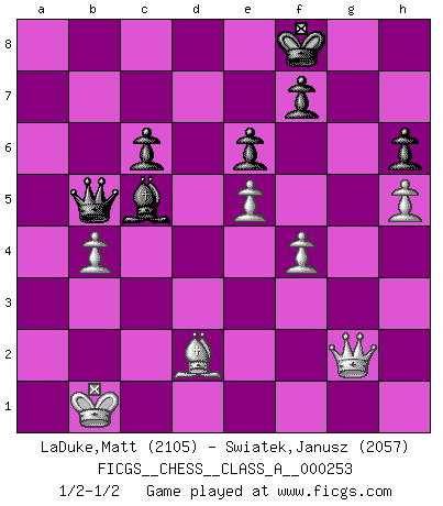 Last move : 1/2-1/2 2022 January 25 17:11:29 [Event "FICGS__CHESS__CLASS_A__000253"] [Site "FICGS"] [Date "2021.11.25"] [Round "1"] [White "LaDuke,Matt"] [Black "Swiatek,Janusz"] [Result "1/2-1/2"] [WhiteElo "2105"] [BlackElo "2057"] 1.e4 c6 2.d4 d5 3.Nc3 dxe4 4.Nxe4 Bf5 5.Ng3 Bg6 6.h4 h6 7.Nf3 Nd7 8.Bd3 Bxd3 9.Qxd3 e6 10.Bf4 Qa5+ 11.Bd2 Qc7 12.O-O-O Ngf6 13.Kb1 Be7 14.Ne4 Rd8 15.Rhg1 Nxe4 16.Qxe4 Nf6 17.Qe2 Ng4 18.h5 O-O 19.Ne5 Nxe5 20.dxe5 Rd5 21.f4 Rfd8 22.Be3 Qa5 23.Rxd5 Rxd5 24.Rf1 Bb4 25.Rf3 Bc5 26.Bc1 Qd8 27.Rf1 Bb4 28.c3 Be7 29.g4 b5 30.Kc2 a5 31.Qe3 Qb8 32.Re1 Qf8 33.Qb6 Qa8 34.Qg1 Bh4 35.Re2 Qa6 36.Re4 a4 37.g5 b4 38.c4 b3+ 39.Kb1 Rd3 40.gxh6 Rg3 41.Qh2 a3 42.axb3 axb2 43.Qxb2 Qb6 44.b4 gxh6 45.Rd4 Be7 46.c5 Qb5 47.Qc2 Qf1 48.Rd2 Rg1 49.Rf2 Qb5 50.Rg2+ Rxg2 51.Qxg2+ Kf8 52.Bd2 Bxc5 1/2-1/2 Caro-Kann : Classical, 7...Nd7 Queenside Castling by player White (move 12) Kingside Castling by player Black (move 18) This chess game ended in a draw. Follow this game move after move (download)Chess is a more highly symbolic game, but the aggressions are therefore even more frankly represented in the play. It probably began as a war game; that is, the representation of a miniature battle between the forces of two kingdoms. (Karl Meninger) Vielleicht wirkt die Aura früherer Spieler glanzvoller als die der heutigen Spieler, aber das liegt daran, dass man kein Programm wie Fritz hatte, das einem all die Löcher in ihren Partien zeigt. (Vladimir Kramnik) Después de una mala apertura, hay una esperanza en el juego medio. Pero una vez que estas en finales, el momento de la verdad ha llegado. (Edmar Mednis) Je fais ceci parce que dans cinquante coups j'obtiendrai cela; je m'appelle Mikhail Moisevitch Botvinnik. (Botvinnik) It's not the size of the dog in the fight, it's the size of the fight in the dog. (Mark Twain)