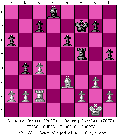 Last move : 1/2-1/2 2021 December 16 18:26:22 [Event "FICGS__CHESS__CLASS_A__000253"] [Site "FICGS"] [Date "2021.11.25"] [Round "1"] [White "Swiatek,Janusz"] [Black "Bovary,Charles"] [Result "1/2-1/2"] [WhiteElo "2057"] [BlackElo "2072"] 1.e4 e5 2.Nf3 Nc6 3.Bb5 a6 4.Ba4 Nf6 5.O-O Nxe4 6.d4 b5 7.Bb3 d5 8.dxe5 Be6 9.Nbd2 Nc5 10.c3 Be7 11.Bc2 d4 12.Nb3 d3 13.Nxc5 dxc2 14.Qxd8+ Rxd8 15.Nxe6 fxe6 16.Be3 Rd5 17.Rfc1 Nxe5 18.Nxe5 Rxe5 19.Bd4 Rg5 20.Rxc2 Kf7 21.Be3 Rf5 22.c4 b4 23.Rd1 Rd8 24.Rxd8 Bxd8 25.g3 h5 1/2-1/2 Ruy Lopez : Open, 7.Bb3 Kingside Castling by player White (move 5) This chess game ended in a draw. Follow this game move after move (download)Chess, like love, like music, has the power to make people happy. (Siegbert Tarrasch) Ein Springer auf f6 gegen die eigene Rochadestellung ist schlimmer als ein rostiger Nagel im Knie. (Efim Bogoljubov) Creo que una cierta cantidad de temperamento es esperada de los genios del Ajedrez. (Ron Gross) Les échecs, c'est l'art d'analyser. (Mikhail Botvinnik) Work expands to fill the time available. (C. Northcote Parkinson, in Parkinson's Laws)