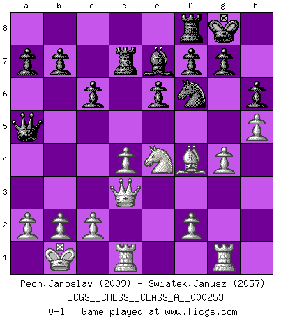 Last move : 0-1 2022 April 10 14:59:18 [Event "FICGS__CHESS__CLASS_A__000253"] [Site "FICGS"] [Date "2021.11.25"] [Round "1"] [White "Pech,Jaroslav"] [Black "Swiatek,Janusz"] [Result "0-1"] [WhiteElo "2009"] [BlackElo "2057"] 1.e4 c6 2.d4 d5 3.Nc3 dxe4 4.Nxe4 Bf5 5.Ng3 Bg6 6.h4 h6 7.Nf3 Nd7 8.h5 Bh7 9.Bd3 Bxd3 10.Qxd3 e6 11.Bf4 Ngf6 12.O-O-O Be7 13.Kb1 Qa5 14.Ne5 O-O 15.Nxd7 Nxd7 16.Ne4 Nf6 17.g4 Rad8 18.Rhg1 Rd7 0-1 This chess game has been lost on time (started : 2021.11.25 23:27:55) Caro-Kann : Classical, 7...Nd7 Queenside Castling by player White (move 12) Kingside Castling by player Black (move 14) Player Black won this chess game. Follow this game move after move (download)Live, lose, and learn, by observing your opponent how to win. (Amber Steenbock) Im Wettkampf zwischen starken Meistern kommen Fehler sehr selten vor, deshalb ist es mit bloßem Warten nicht getan. (José Raúl Capablanca) Un sacrificio se refuta mucho mejor al aceptarlo. (Wilhelm Steinitz) Je crois qu'il existe des manières très spécifiques de jouer efficacement contre une machine. Evidemment, nous n'avons aucune chance en technique pure, parce que l'ordinateur calcule de manière parfaite. Mais lorsque nous faisons appel à notre cerveau, en utilisant l'intuition et la compréhension, alors nous restons beaucoup plus forts. (Anatoli Karpov) Warrior pose battles inner weakness and wins focus. You see that there is no war within you. You're on your own side, and you are your own strength. (Terri Guillemets)