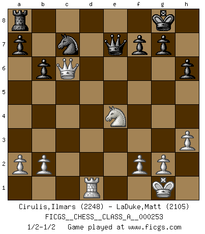 Last move : 1/2-1/2 2021 December 20 2:28:30 [Event "FICGS__CHESS__CLASS_A__000253"] [Site "FICGS"] [Date "2021.11.25"] [Round "1"] [White "Cirulis,Ilmars"] [Black "LaDuke,Matt"] [Result "1/2-1/2"] [WhiteElo "2248"] [BlackElo "2105"] 1.d4 d5 2.Nf3 Nf6 3.c4 e6 4.Nc3 Bb4 5.Bg5 h6 6.Bxf6 Qxf6 7.e3 O-O 8.Rc1 dxc4 9.Bxc4 c5 10.Qb3 Qe7 11.O-O cxd4 12.Nxd4 Bc5 13.Rfd1 b6 14.Ne4 Bxd4 15.exd4 Bb7 16.d5 exd5 17.Bxd5 Bxd5 18.Qxd5 Na6 19.Qc4 Rfd8 20.h3 Rxd1+ 21.Rxd1 Nc7 22.Qc6 1/2-1/2 Queen's pawn game Kingside Castling by player Black (move 7) Kingside Castling by player White (move 11) This chess game ended in a draw. Follow this game move after move (download)To avoid losing a piece, many a person has lost the game. (Savielly Tartakover) Auf Remis zu spielen ist gewissermaßen ein Verbrechen gegen das Schachspiel. (Mikhail Nekhemyevich Tal) Tu puedes aprender mucho mas de una partida que pierdas que de una partida ganada. Tendras que perder cientos de partidas antes de llegar a ser un buen jugador. (Jose Raul Capablanca) Des combinaisons [dans le jeu d'échecs] pareilles à des mélodies. Je crois entendre pour ainsi dire la musique des coups... (Vladimir Nabokov) Always be a first-rate version of yourself, instead of a second-rate version of somebody else. (Judy Garland)