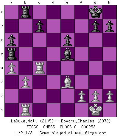 Last move : 1/2-1/2 2021 December 24 1:29:17 [Event "FICGS__CHESS__CLASS_A__000253"] [Site "FICGS"] [Date "2021.11.25"] [Round "1"] [White "LaDuke,Matt"] [Black "Bovary,Charles"] [Result "1/2-1/2"] [WhiteElo "2105"] [BlackElo "2072"] 1.e4 e5 2.Nf3 Nc6 3.Bb5 a6 4.Ba4 Nf6 5.O-O Nxe4 6.d4 b5 7.Bb3 d5 8.dxe5 Be6 9.Nbd2 Nc5 10.c3 Be7 11.Bc2 d4 12.Ne4 d3 13.Nxc5 dxc2 14.Qxd8+ Rxd8 15.Nxe6 fxe6 16.Be3 O-O 17.Rfc1 Rd5 18.c4 bxc4 19.Rxc2 Nxe5 20.Nxe5 Rxe5 21.Rxc4 Bf6 22.Rb1 Ra5 23.a4 Rb8 24.b3 Be5 1/2-1/2 Ruy Lopez : Open, 7.Bb3 Kingside Castling by player White (move 5) Kingside Castling by player Black (move 16) This chess game ended in a draw. Follow this game move after move (download)Chess is a fairy tale of 1001 blunders. (Savielly Tartakower) Wenn sie aufgeben, dann danke ich Ihnen für das Spiel (Eventualzug beim Fernschach). (Anonymous) Debemos de asegurarnos de que el Ajedrez no se convierta en un lenguaje muerto, muy interesante, pero tan solo para un grupo muy pequeño. (Sytze Faber) La conception d'un plan est le processus par lequel un joueur exploite les avantages de sa position tout en s'efforçant d'en réduire au minimum les inconvénients. Afin de garantir le succès, un plan doit toujours se fonder sur un diagnostic objectif des particularités d'une position. La conception d'un plan est d'autant plus difficile que la position est équilibrée, et grandement facilitée lorsqu'il n'existe qu'un seul plan susceptible de répondre aux exigences de la position. (Harry Golombek) Hello Thibault, if I have had a plan (and I had one, I hope), I have forgotten it during the last week... - Hello Heinz-Georg. What do you mean a plan ? (Anonymous players, during a Big Chess game)