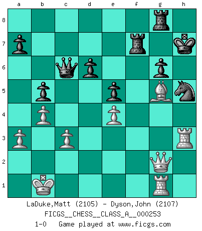 Last move : 1-0 2022 June 29 15:54:27 [Event "FICGS__CHESS__CLASS_A__000253"] [Site "FICGS"] [Date "2021.11.25"] [Round "1"] [White "LaDuke,Matt"] [Black "Dyson,John"] [Result "1-0"] [WhiteElo "2105"] [BlackElo "2107"] 1.e4 c5 2.Nc3 Nc6 3.Nf3 g6 4.d4 cxd4 5.Nxd4 Bg7 6.Be3 Nf6 7.Bc4 O-O 8.Bb3 d6 9.f3 Na5 10.Qd2 Bd7 11.h4 h5 12.O-O-O Nxb3+ 13.cxb3 Rc8 14.Kb1 Qa5 15.a3 Kh7 16.Bg5 Qc5 17.Be3 Qa5 18.Bg5 Qc5 19.Rhe1 Rfe8 20.Re3 b5 21.Nc2 Bc6 22.b4 Qb6 23.g4 hxg4 24.h5 gxf3 25.hxg6+ fxg6 26.Qf2 Rf8 27.Qxf3 Nh5 28.Qg2 Rf7 29.Rg1 Bxc3 30.bxc3 Rg8 31.Nd4 e5 32.Nxc6 Qxc6 33.Rh3 1-0 This chess game has been lost on time (started : 2021.11.25 23:27:55) Sicilian : Closed, 2...Nc6 Kingside Castling by player Black (move 7) Queenside Castling by player White (move 12) Player White won this chess game. Follow this game move after move (download)It was clear to me that the vulnerable point of the American Grandmaster (Bobby Fischer) was in double-edged, hanging, irrational positions, where he often failed to find a win even in a won position. (Efim Geller) Fischer ist das größte Genie, das je vom Schachhimmel heruntergestiegen ist. (Mikhail Nekhemyevich Tal) Alguna parte de un error es siempre correcto. (Savielly Tartakover) Demandez au pauvre Cg1 ce qu'il en pense. Eduard Gufeld à propos de la variante Saemisch de l'Est-Indienne. It is not enough to be a good player... you must also play well. (Siegbert Tarrasch)