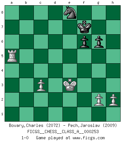 Last move : 1-0 2022 July 6 13:18:19 [Event "FICGS__CHESS__CLASS_A__000253"] [Site "FICGS"] [Date "2021.11.25"] [Round "1"] [White "Bovary,Charles"] [Black "Pech,Jaroslav"] [Result "1-0"] [WhiteElo "2072"] [BlackElo "2009"] 1.d4 Nf6 2.c4 e6 3.Nc3 Bb4 4.f3 c5 5.d5 O-O 6.e4 b5 7.e5 Ne8 8.f4 exd5 9.cxd5 d6 10.Nf3 Nc7 11.a4 Bb7 12.Bd3 g6 13.O-O c4 14.Be4 Nd7 15.f5 Nxe5 16.Nxe5 dxe5 17.Qf3 Bxc3 18.bxc3 Bxd5 19.Ba3 Bxe4 20.Qxe4 Qd5 21.Qh4 Rfd8 22.fxg6 hxg6 23.Be7 Ne6 24.axb5 Ng7 25.Bxd8 Rxd8 26.Rad1 Qc5+ 27.Qf2 Qxf2+ 28.Kxf2 Rb8 29.Rd5 Ne6 30.Rxe5 Nc7 31.Rb1 Rb7 32.Rc5 f6 33.Rxc4 Rxb5 34.Rxb5 Nxb5 35.Rc5 Nd6 36.Rc6 Ne8 37.Ke3 a5 38.Ra6 Kf7 39.Rxa5 1-0 Nimzo-Indian : Kmoch variation Kingside Castling by player Black (move 5) Kingside Castling by player White (move 13) 10 pieces endgame at move 34 : White KRPPP , Black KNPPP WHITE : King + 1 Rook 3 Pawns BLACK : King + 1 Knight 3 Pawns 9 pieces endgame at move 39 : White KRPPP , Black KNPP WHITE : King + 1 Rook 3 Pawns BLACK : King + 1 Knight 2 Pawns Player White won this chess game. Follow this game move after move (download)If your opponent cannot do anything active, then don't rush the position; instead you should let him sit there, suffer, and beg you for a draw. (Jeremy Silman) Ich war zu klein für die Schach-Schülermannschaft! (Woody Allen) Cuando veas una buena jugada, trata de encontrar otra mejor. (Emanuel Lasker) La guerre est enfant de la passion, la passion est enfant du narcissisme et le narcissisme est l'enfant. (...) Une autre partie ? (Thibault de Vassal) They say poker is a zero-sum game. It must be, because every time I play my sum ends up zero. (Max Shapiro)