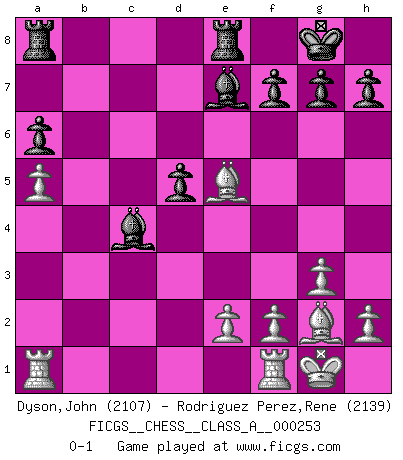 Last move : 0-1 2022 June 26 17:10:1 [Event "FICGS__CHESS__CLASS_A__000253"] [Site "FICGS"] [Date "2021.11.25"] [Round "1"] [White "Dyson,John"] [Black "Rodriguez Perez,Rene"] [Result "0-1"] [WhiteElo "2107"] [BlackElo "2139"] 1.Nf3 d5 2.g3 Nf6 3.Bg2 c6 4.O-O Bf5 5.d3 e6 6.c4 dxc4 7.dxc4 Qxd1 8.Rxd1 Nbd7 9.Bf4 Bc5 10.Nc3 Ng4 11.Rf1 e5 12.Bd2 Ngf6 13.b4 Be7 14.b5 O-O 15.a4 Be6 16.a5 Rab8 17.Be3 a6 18.Ba7 Ra8 19.bxc6 bxc6 20.Bb6 Bxc4 21.Bc7 Nd5 22.Nxe5 Nxe5 23.Bxe5 Rfe8 24.Nxd5 cxd5 0-1 This chess game has been lost on time (started : 2021.11.25 23:27:55) Reti : King's Indian attack (Barcza system) Kingside Castling by player White (move 4) Kingside Castling by player Black (move 14) Player Black won this chess game. Follow this game move after move (download)Tactics flow from a superior position. (Bobby Fischer) Irgendwie scheint mir sonntags früh um 9 Uhr der Killerinstinkt verloren gegangen zu sein. (Alexej Shirov) La captura del Rey enemigo es la finalidad pero no el primer objetivo de la partida. (William Steinitz) Il vaut toujours mieux jouer un plan faux de façon logique que de n'avoir pas de plan du tout. (Victor Kortchnoï) Those parts of the system that you can hit with a hammer (not advised) are called hardware; those program instructions that you can only curse at are called software. (Anonymous)