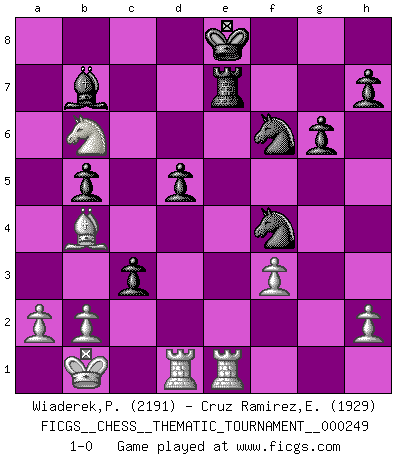Last move : 1-0 2021 December 31 6:24:12 [Event "FICGS__CHESS__THEMATIC_TOURNAMENT__000249"] [Site "FICGS"] [Date "2021.11.26"] [Round "1"] [White "Wiaderek,Piotr"] [Black "Cruz Ramirez,Eliecer"] [Result "1-0"] [WhiteElo "2191"] [BlackElo "1929"] 1.d4 d5 2.Nf3 Nf6 3.c4 e6 4.Nc3 c6 5.Qd3 dxc4 6.Qxc4 b5 7.Qd3 a6 8.g4 Nxg4 9.Rg1 Nf6 10.e4 Bb7 11.Bf4 Nbd7 12.O-O-O Rc8 13.Kb1 b4 14.Na4 c5 15.d5 c4 16.Qc2 exd5 17.Bh3 Be7 18.e5 Nh5 19.Be3 g6 20.e6 fxe6 21.Bxe6 Nf8 22.Bg4 Nf6 23.Bh3 Rc6 24.Ne5 Re6 25.Bd4 Rg8 26.Rge1 Qc7 27.f3 Rg7 28.Bxe6 Nxe6 29.Bb6 Qc8 30.Ba5 c3 31.Nb6 Qc5 32.Qa4+ Qb5 33.Qxb5+ axb5 34.Nc6 Nf4 35.Nxe7 Rxe7 36.Bxb4 1-0 Queen's pawn game Queenside Castling by player White (move 12) Player White won this chess game. Follow this game move after move (download)Of Chess it has been said that life is not long enough for it, but that is the fault of life, not Chess. (William Ewart Napier) Ich verachte die Medien. (Robert James Fischer) En manos de Fischer's, una diminuta ventaja teórica es tan buena como tener una Reina de ventaja. (Isaac Kashdan) Le succès, c'est être capable d'aller d'échec en échec sans perdre son enthousiasme. (Winston Churchill) He is a liar. I just don't know what the lie is yet. (Horatio Caine, C.S.I. Miami)
