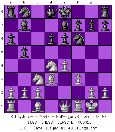 Last move : 1-0 2007 September 4 7:6:34 [Event "FICGS__CHESS__CLASS_B__000026"] [Site "FICGS"] [Date "2007.07.25"] [Round "1"] [White "Riha,Josef"] [Black "Gaffagan,Steven"] [Result "1-0"] [WhiteElo "1969"] [BlackElo "1846"] 1.e4 c5 2.Nf3 d6 3.d4 cxd4 4.Nxd4 Nf6 5.Nc3 a6 6.Bc4 e6 7.O-O b5 8.Bd3 Bb7 9.f3 Be7 10.Qe1 1-0 This chess game has been lost on time (started : 2007.07.25 0:43:9) Sicilian : Najdorf, Lipnitzky attack Kingside Castling by player White (move 7) Player White won this chess game. Follow this game move after move (download)One doesn't have to play well, it's enough to play better than your opponent. (Siegbert Tarrasch) Ein Gewinn durch eine ungenaue Kombination, sei sie auch noch so vorzeigbar, erfüllt mich mit Schaudern. (Wilhelm Steinitz) Observen a Garry Kasparov. Después de una derrota, invariablemente el gana la próxima partida. Prácticamente hace pedazos a su siguiente oponente. Eso es algo que tenemos que aprender a lograr. (Maurice Ashley) Ne tendez aucun piège pour le plaisir ! Ne jouez rien dans l'espoir que l'adversaire réagisse de façon stupide ! Prenez toujours pour acquis que l'adversaire va trouver le meilleur coup ! Ne jouez jamais de coup dans l'espoir que l'adversaire ne voie pas la menace ! Chacun de vos coups doit améliorer la position d'une façon ou d'une autre. Quotation,n.: The act of repeating erroneously the words of another. The words erroneously repeated. (Ambrose Bierce, The Devil's Dictionary)