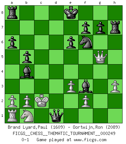 Last move : 0-1 2021 December 20 16:12:58 [Event "FICGS__CHESS__THEMATIC_TOURNAMENT__000249"] [Site "FICGS"] [Date "2021.11.26"] [Round "1"] [White "Brand Lyard,Paul"] [Black "Oortwijn,Ron"] [Result "0-1"] [WhiteElo "1609"] [BlackElo "2089"] 1.d4 d5 2.Nf3 Nf6 3.c4 e6 4.Nc3 c6 5.Qd3 dxc4 6.Qxc4 b5 7.Qd3 a6 8.g4 Nxg4 9.h3 Nf6 10.Bg2 Nbd7 11.Ng5 Bb7 12.Bf4 Nh5 13.Nxh7 Nxf4 14.Qf3 Nxg2+ 15.Qxg2 Rxh7 16.Qg4 c5 17.Rg1 Nf6 18.Qg5 cxd4 19.Nb1 Bb4+ 20.Kd1 d3 21.e3 Bf3+ 22.Kc1 d2+ 23.Kc2 d1Q+ 24.Rxd1 Qxd1+ 0-1 Queen's pawn game Promotion Queen by player Black (move 23) Player Black won this chess game. Follow this game move after move (download)Let the perfectionist play postal. (Yasser Seirawan) Man wirke der falschen Auffassung entgegen, als ob jeder Zug Unmittelbares zu leisten habe; auch Werte- und Ruhezüge haben ihre Existenzberechtigung. (Aaron Nimzowitsch) Yo he agregado estos principios a la ley: pongan los Caballos en acción antes de que los dos Alfiles sean desarrollados. (Emanuel Lasker) L'action d'une oeuvre littéraire se déroule sur un champ de bataille. Les masques et les types du drame moderne correspondent aux pièces du jeu d'échecs. L'intrigue correspond aux coups et aux gambits, c'est à dire aux techniques du jeu telles qu'utilisées et interprétées par les joueurs. Les tactiques et les péripéties [mouvements] correspondent aux coups exécutés par l'adversaire. (Viktor Shklovsky) There are three kinds of lies: lies, damned lies and statistics. (Mark Twain)
