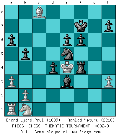 Last move : 0-1 2021 December 23 23:44:27 [Event "FICGS__CHESS__THEMATIC_TOURNAMENT__000249"] [Site "FICGS"] [Date "2021.11.26"] [Round "1"] [White "Brand Lyard,Paul"] [Black "Aahlad,Yeturu"] [Result "0-1"] [WhiteElo "1609"] [BlackElo "2210"] 1.d4 d5 2.Nf3 Nf6 3.c4 e6 4.Nc3 c6 5.Qd3 dxc4 6.Qxc4 b5 7.Qd3 a6 8.g4 Nxg4 9.h3 Nf6 10.Bg5 Bb7 11.Ne5 c5 12.Rg1 Qxd4 13.Qxd4 cxd4 14.Bxf6 gxf6 15.Nxf7 Kxf7 16.Nb1 Bb4+ 17.Kd1 Nd7 18.f4 Rac8 19.a3 Bd6 20.Bg2 Rhg8 21.Bxb7 Rxg1+ 22.Kd2 Bxf4+ 23.e3 Bxe3+ 24.Kd3 Ne5+ 25.Ke4 Rf1 26.Bxc8 Rf4+ 0-1 Queen's pawn game Player Black won this chess game. Follow this game move after move (download)We must make sure that Chess will not be like a dead language, very interesting, but for a very small group. (Sytze Faber) Frage: Was machen Sie mit den Preisen? Anwort: Ich habe Angst, dass meine Freundin davon neue Kleider kauft. (Loek van Wely) El Ajedrez es despiadado: debes de estar preparado para matar gente. (Nigel Short) On peut tirer plus d'utilité d'une partie perdue que de 100 parties gagnées. (Capablanca) A computer lets you make more mistakes faster than any invention in human history - with the possible exceptions of handguns and tequila. (Mitch Ratcliffe)