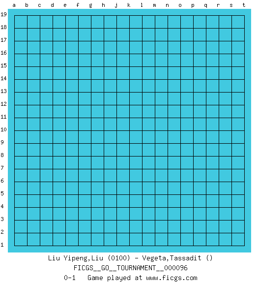 Last move : 0-1 2021 December 29 12:20:46 [Event "FICGS__GO__TOURNAMENT__000096"] [Site "FICGS"] [Date "2021.11.28"] [Round "1"] [Black "Liu Yipeng,Liu"] [White "Vegeta,Tassadit"] [Result "0-1"] [Rating 1 "0100"] 0-1 This go game has been lost on time (started : 2021.11.28 23:18:13) Here are the names of the openings (joseki) played in the four corners : Player White won this Go (weiqi, baduk) game. Follow this game move after move (download)Everything would seem to be possible in Go. Like pulling a rabbit, by a magical move, out of a hat. (Pierre Audouard) When you don't know what to do, walk fast and look worried. (Anonymous)