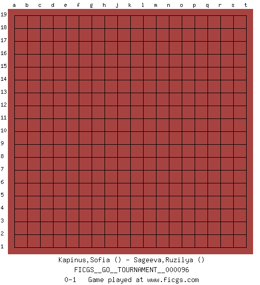 Last move : 0-1 2021 December 29 12:20:46 [Event "FICGS__GO__TOURNAMENT__000096"] [Site "FICGS"] [Date "2021.11.28"] [Round "1"] [Black "Kapinus,Sofia"] [White "Sageeva,Ruzilya"] [Result "0-1"] 0-1 This go game has been lost on time (started : 2021.11.28 23:18:13) Here are the names of the openings (joseki) played in the four corners : Player White won this Go (weiqi, baduk) game. Follow this game move after move (download)Territory really exists only in the end. (Pierre Audouard) The leaves of memory seemed to make a mournful rustling in the dark. (Henry Wadsworth Longfellow)