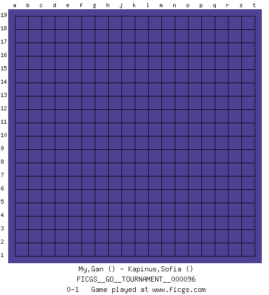 Last move : 0-1 2021 December 29 12:20:46 [Event "FICGS__GO__TOURNAMENT__000096"] [Site "FICGS"] [Date "2021.11.28"] [Round "1"] [Black "My,Gan"] [White "Kapinus,Sofia"] [Result "0-1"] 0-1 This go game has been lost on time (started : 2021.11.28 23:18:13) Here are the names of the openings (joseki) played in the four corners : Player White won this Go (weiqi, baduk) game. Follow this game move after move (download)For rectangular six in the corner, dame is necessary. (Anonymous) Animated gif is worth one mega-word. (Unknown)