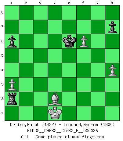 Last move : 0-1 2007 November 1 0:56:7 [Event "FICGS__CHESS__CLASS_B__000026"] [Site "FICGS"] [Date "2007.07.25"] [Round "1"] [White "Deline,Ralph"] [Black "Leonard,Andrew"] [Result "0-1"] [WhiteElo "1822"] [BlackElo "1800"] 1.e4 g6 2.d4 Bg7 3.Nc3 c5 4.dxc5 Bxc3+ 5.bxc3 Qa5 6.Ne2 Nf6 7.f3 Qxc5 8.Qd4 Qa5 9.Bh6 Rg8 10.Qd2 g5 11.h4 g4 12.Bg5 gxf3 13.gxf3 Nh5 14.Qd5 Nc6 15.Rd1 Qxd5 16.exd5 Ne5 17.Nd4 Ng3 18.Rg1 Nxf1 19.Kxf1 f6 20.Re1 d6 21.f4 Ng4 22.Rxg4 Bxg4 23.Bxf6 Kf7 24.Bxe7 Rae8 25.Bg5 Bh3+ 26.Kf2 Rxe1 27.Kxe1 a6 28.Nb3 b5 29.Na5 Bg2 30.c4 bxc4 31.Nxc4 Bxd5 32.Nxd6+ Ke6 33.c4 Kxd6 34.cxd5 Kxd5 35.f5 Rb8 36.Kd1 Rb2 37.a3 Ke5 38.f6 Ke6 39.Bd2 Ra2 0-1 Robatsch defense 10 pieces endgame at move 34 : White KBPPPP , Black KRPP WHITE : King + 1 Bishop 4 Pawns BLACK : King + 1 Rook 2 Pawns 9 pieces endgame at move 34 : White KBPPP , Black KRPP WHITE : King + 1 Bishop 3 Pawns BLACK : King + 1 Rook 2 Pawns Player Black won this chess game. Follow this game move after move (download)Nonsense was the last thing Fischer was interested in, as far as Chess was concerned. (Elie Agur) Schach ist wie eine schöne Frau, zu der wir ständig zurückkehren, gleichviel, wie oft sie uns zurückweist. (Anonymous) Es muy difícil jugar en contra de la teoría de Einstein. - en su primera derrota en contra de Fischer (Mikhail Tal) C'est la seule position que je connaisse où les deux camps sont mals. Propos prêtés à V. Anand. Statistics can be made to prove anything - even the truth. (Author unknown)